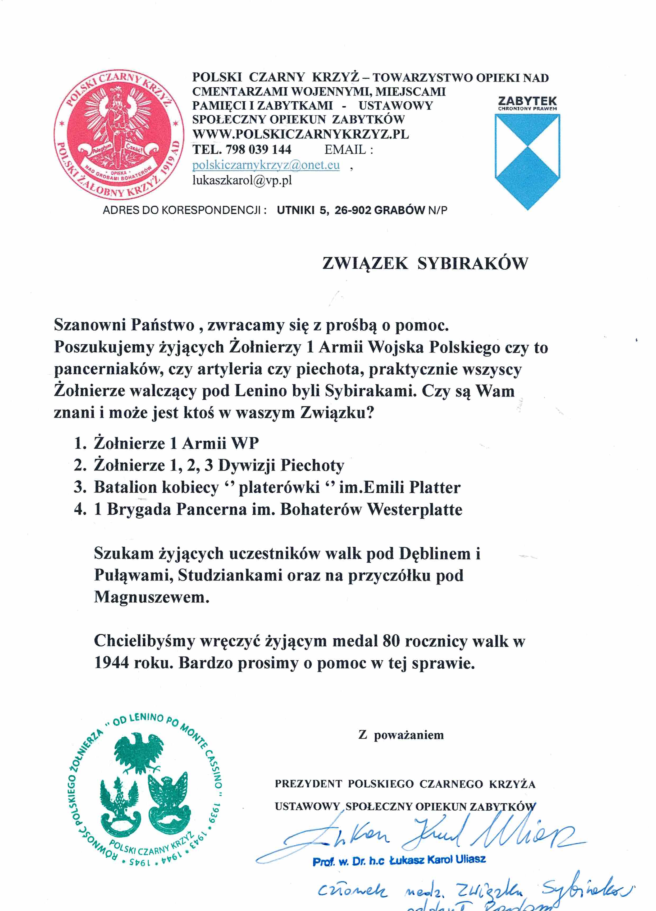 Poszukujemy żyjących Żołnierzy 1 Armii Wojska Polskiego czy to pancerniaków, czy artyleria czy piechota, praktycznie wszyscy Żołnierze walczący pod Lenino byli Sybirakami. Czy są Wam znani i może jest ktoś w waszym Związku?